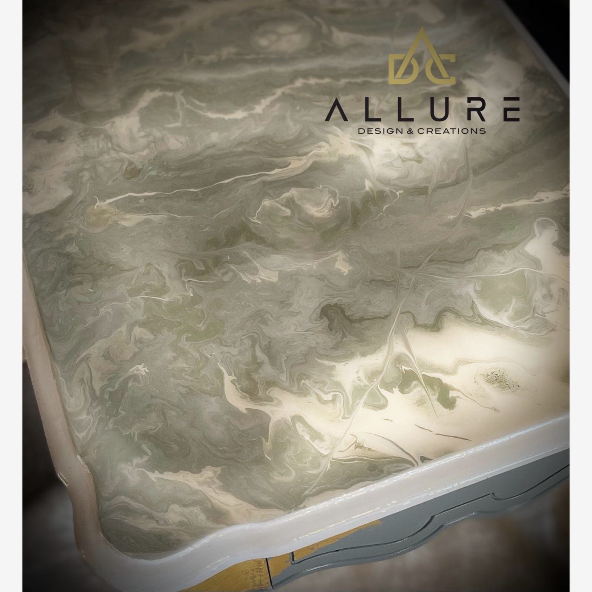 These luxurious Queen Anne Style side tables have been refinished in an earthy green shade with neutral hues. Gold leaf has been added to the sides of the cabriole legs to create an elegant look. The tops feature a glamorous acrylic pour and are sealed with UV protective epoxy for extra protection.